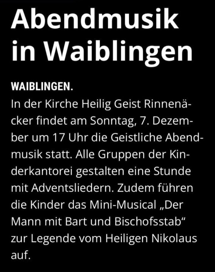 Herzliche Einladung zur Geistlichen Abendmusik am Sonntag, 7. Dezember um 17.00 Uhr Hl. Geist, Rinnenäcker mit allen Gruppen der Kinderkantoreien